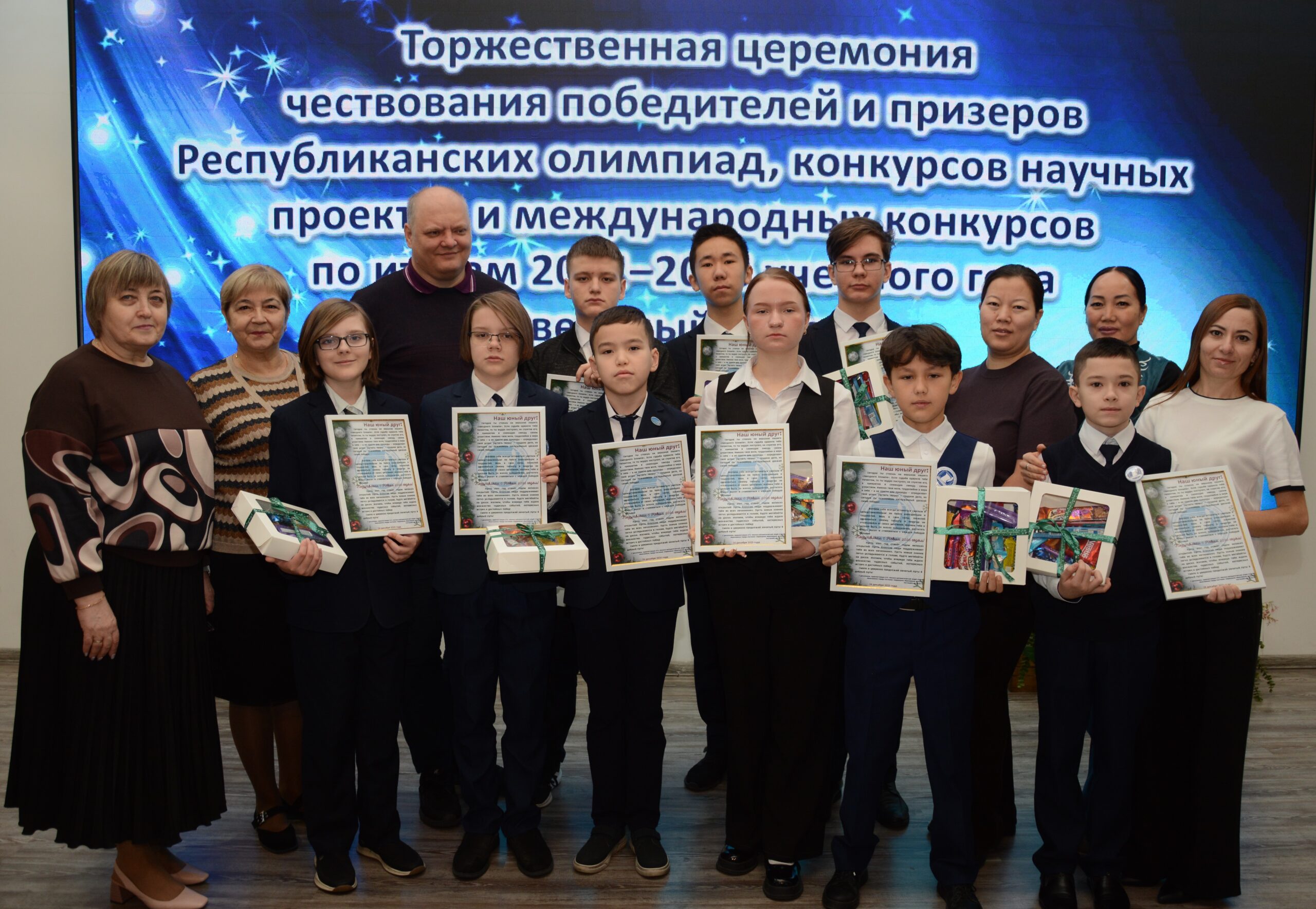 На мероприятии были отмечены учащиеся, которые в течение 2025 года показали выдающиеся результаты в интеллектуальных состязаниях самого высокого уровня: республиканских олимпиадах, конкурсах научных проектов и международных интеллектуальных конкурсах.